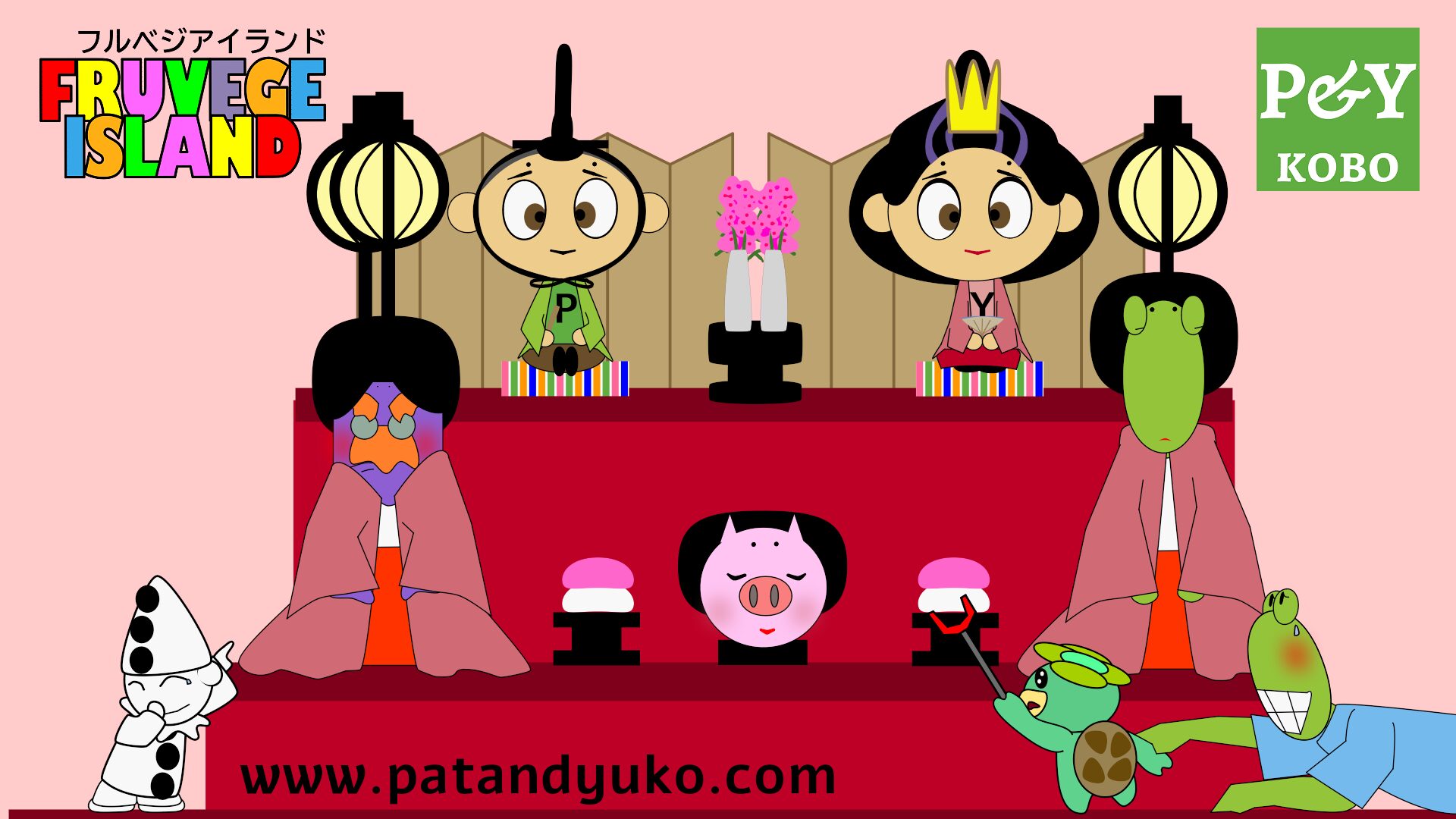 It’s Dolls Festival time and once again our friends on Fruvege Island are all taking part in it. Frogbert has been asked to look after Kappy and Pierre while Pat, Yuko, Max, Lovechan and Frogbetty have prepared for the event. But, can Frogbert really deal with two naughty kids on his own?