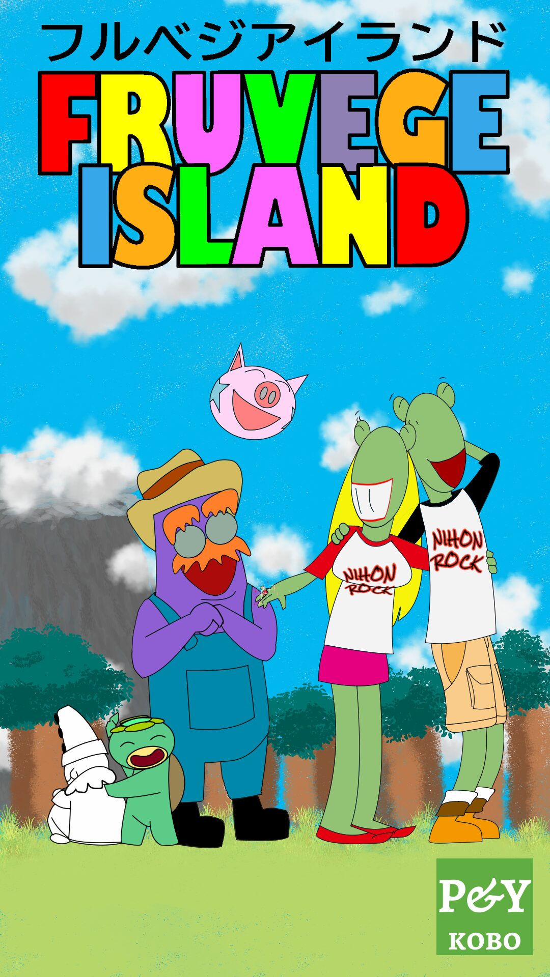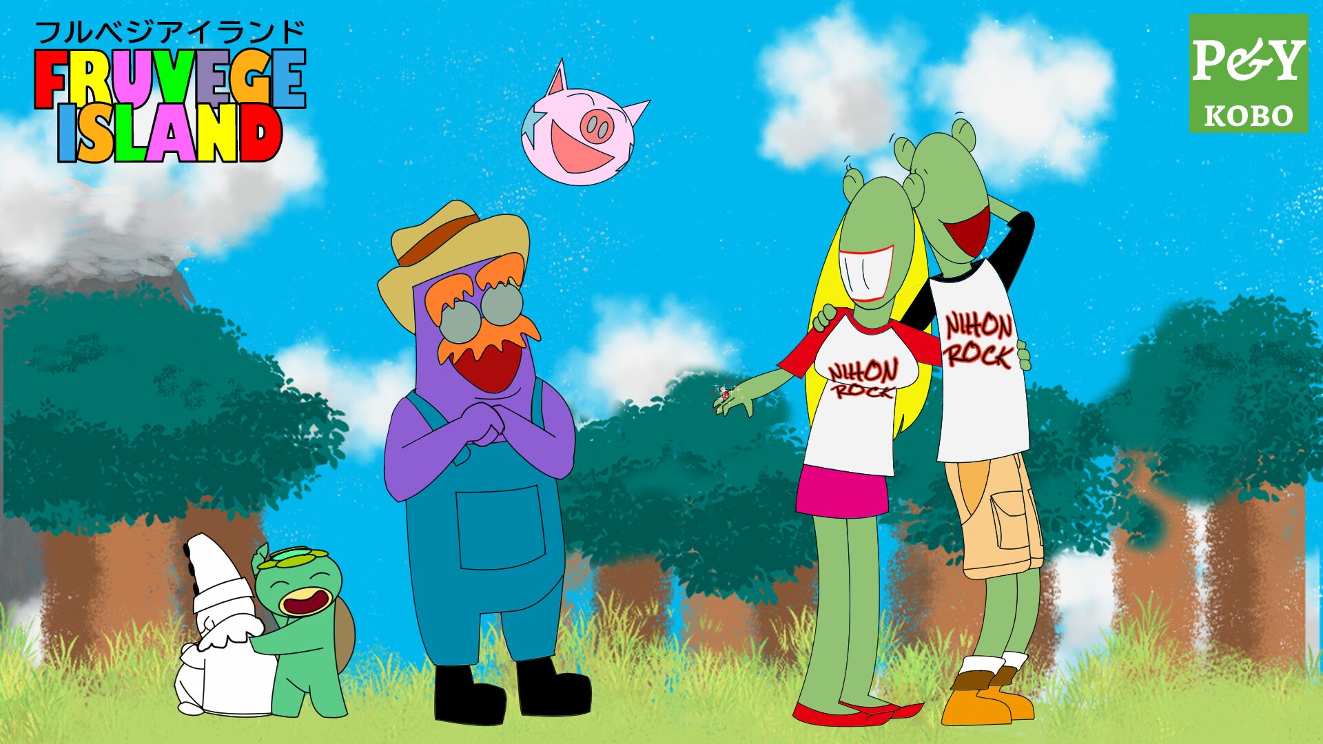 Frogbert and Frogbetty showed off their engagement rings to their good friends Max, Kappy, Love-chan, and Pierre on the hills of “Yummy Forest,” where they could see Mystery Mountain clearly.